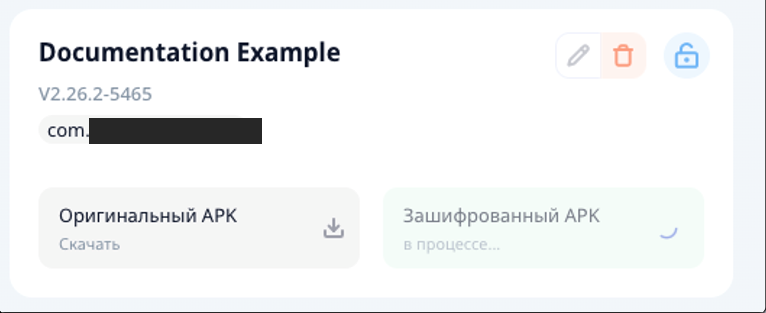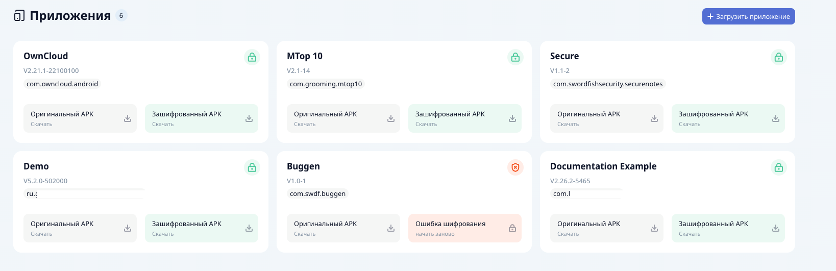 Для каждого приложения отображаются его название, версия, имя сканируемого пакета. На данной странице можно получить исходный файл приложения, узнать о статусе шифрования и осуществить процесс шифрования загруженного ранее приложения.